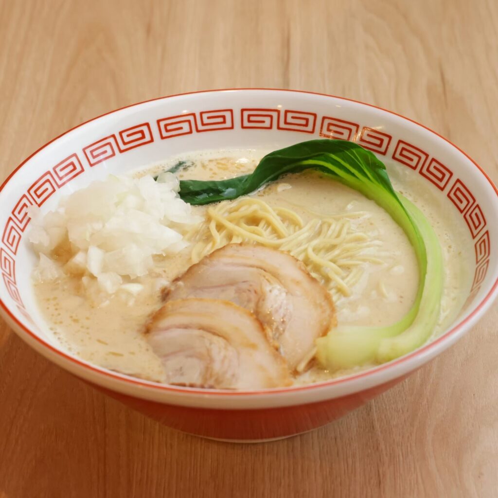 ラーメンの上で存在感を放つのは「無塩焼豚」、「刻み玉ねぎ」そして「青物野菜」の具材たち。特に「刻み玉ねぎ」はザクザクした食感を楽しめ、そして飽きることなく完食にまで導いてくれる。