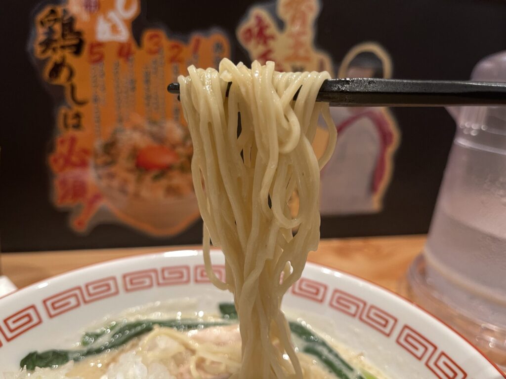 この濃厚スープに絡めるのは、細目で硬めなストレート麺。スープのトロミが硬めの麺とよく合う。噛むとぱつっと切れる食感がたまらない人も多いはず。