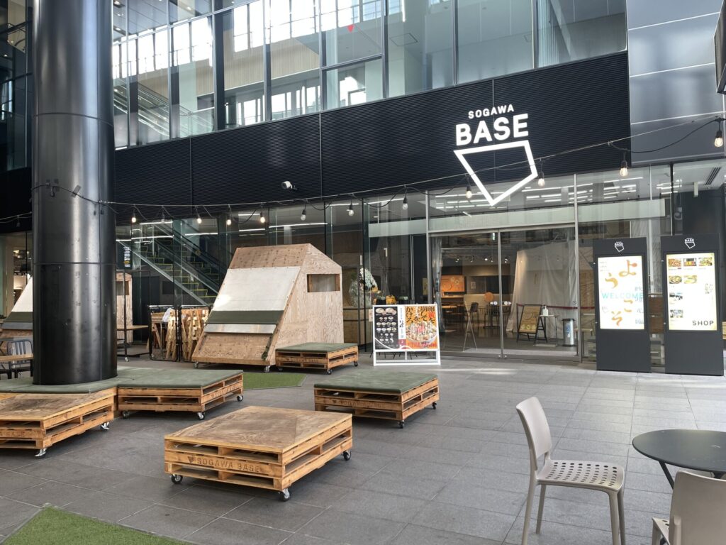 施設内の中央通路に面しているが、大きな暖簾が店舗内を覆い隠してくれるので、通行人の視線はまったく気にならない。ちなみにSOGAWA BASEの共有スペースでも飲食可能だ。