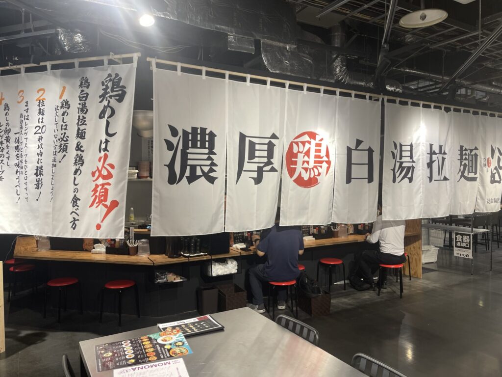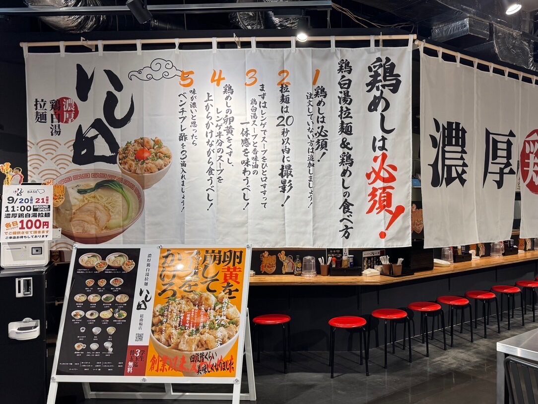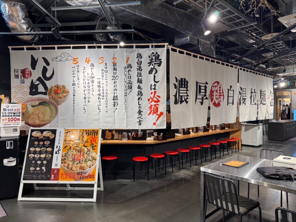 SOGAWA BASEのメインエントランスから入って左側が「鶏白湯拉麺 いし田」の店舗スペースで、食券を買ってからカウンターに座るスタイル。