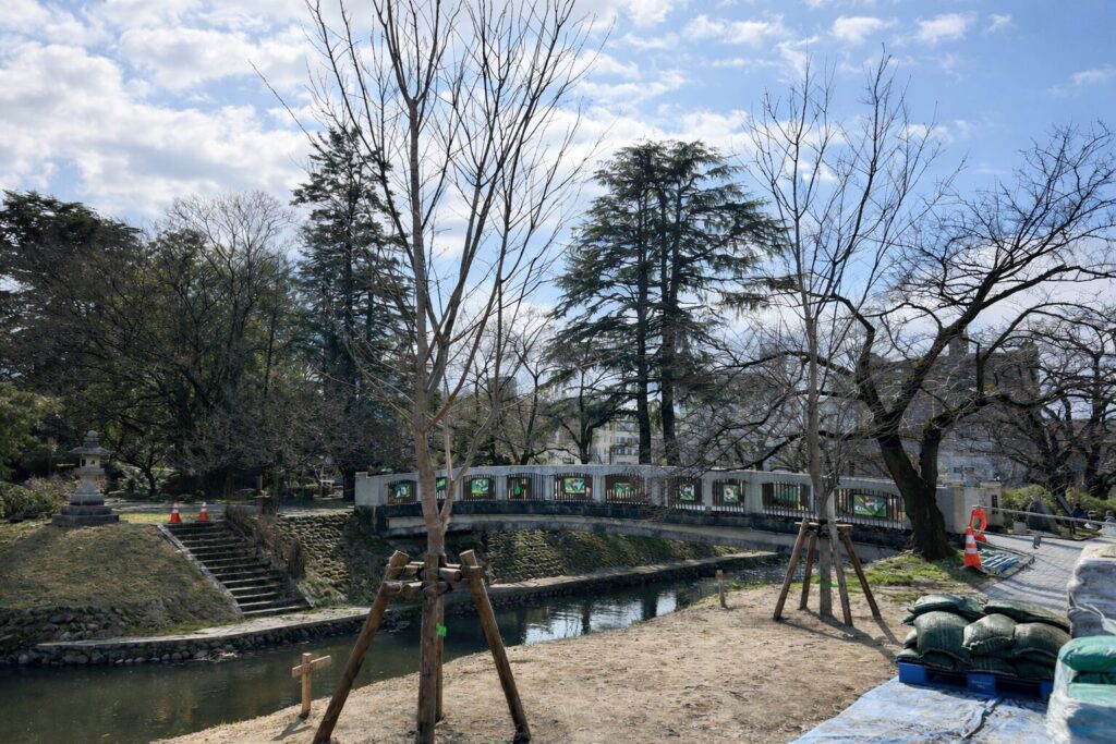 2024年1月の能登半島地震により、松川べりでは約700mという広範囲にわたって護岸が損傷しました。市民の憩いの場を取り戻すべく、発生から半年後の7月に復旧工事がスタート。しかし、重機搬入のため数カ所の桜を伐採することとなりました。