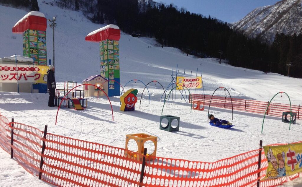 立山山麓スキー場では、「らいちょうバレー」と「極楽坂」の2つのエリアがあります。「らいちょうバレー」は、初級者〜中級者の方向けのエリアです。ふもとにあるキッズパークでは、ベルトコンベアの乗り放題や、チューブ、ストライダー、そり、雪遊びおもちゃ等を貸し出しているのも嬉しいポイントです。