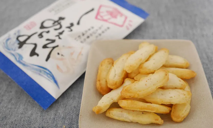 「しろえびあられ」には国産のもち米を100%使用し、地下100mから汲み上げた清らかな地下深層水が使われているところが特徴です。あられならではの深い風味と、素材本来の旨みを最大限に引き出しています。