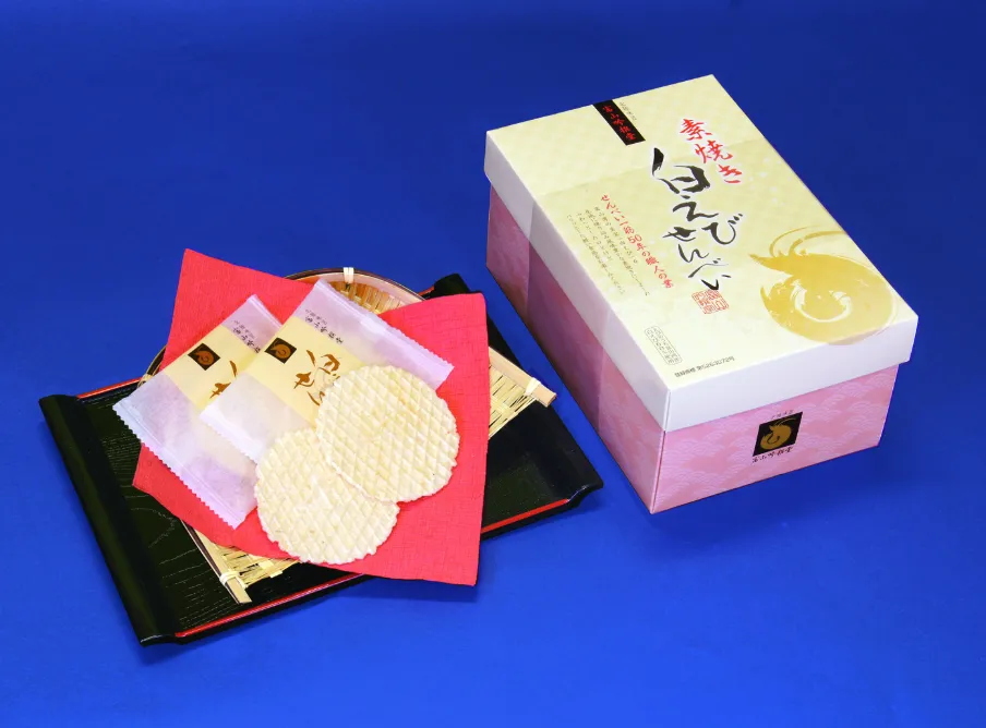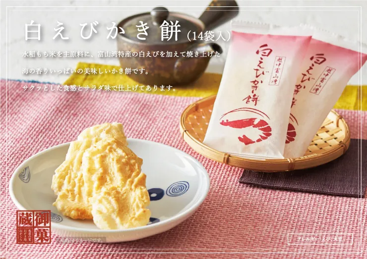 看板商品である「白えびかき餅」は、外はカリッ、中はサクッとした食感、海の香りとほどよいサラダ味が絶妙なバランスに仕上がっています。サイズは、14袋入りと20袋入りから選べます。