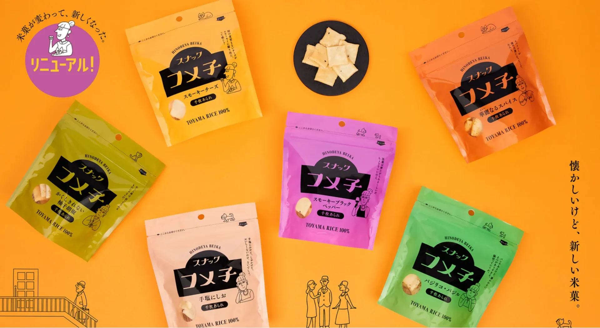 「スナックコメ子」は、2020年から販売している昭和のスナック文化をモチーフにしたユニークなお菓子です。2025年には、薄焼きの千枚あられとしてリニューアルしました。