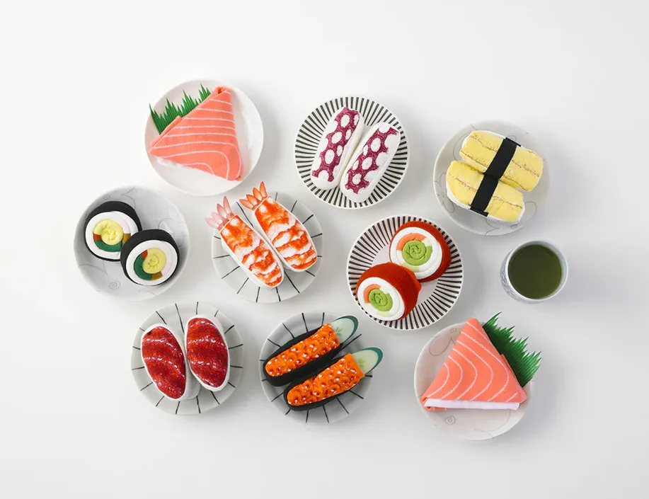 靴下ブランド「助野」が展開する「寿司そっくす」は、まぐろやいくらなど人気の寿司ネタをモチーフにした靴下です。