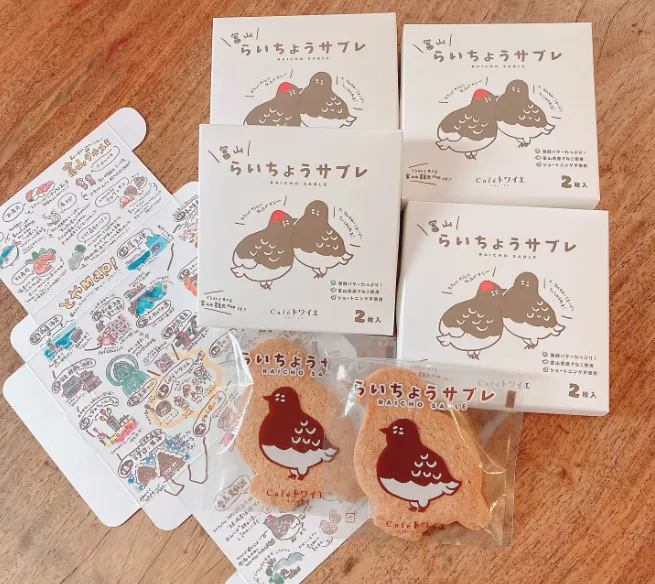 パッケージには雷鳥のつがいが寄り添う姿が描かれ、箱を開けると県内観光地のイラストマップが登場します。旅の余韻を楽しみながら味わえる、かわいい見た目と遊び心があふれたお菓子です。