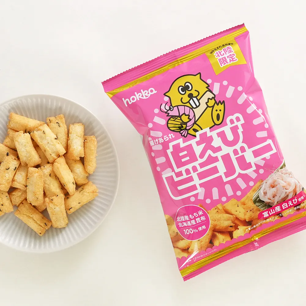 富山名物の白えびを使ったスナック「白えびビーバー」。北陸のソウルフードとして長年愛されてきた「ビーバー」の昆布の旨味に、白えびの甘みを掛け合わせたお菓子です。