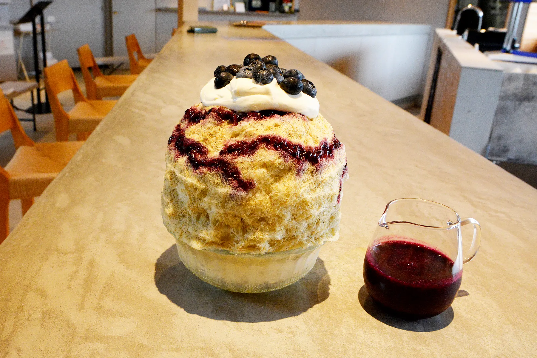 定番人気のピスタチオかき氷に、ブルーベリーを組み合わせた季節限定の一品。フロマージュクリームと一緒に食べると…まるでケーキのよう!