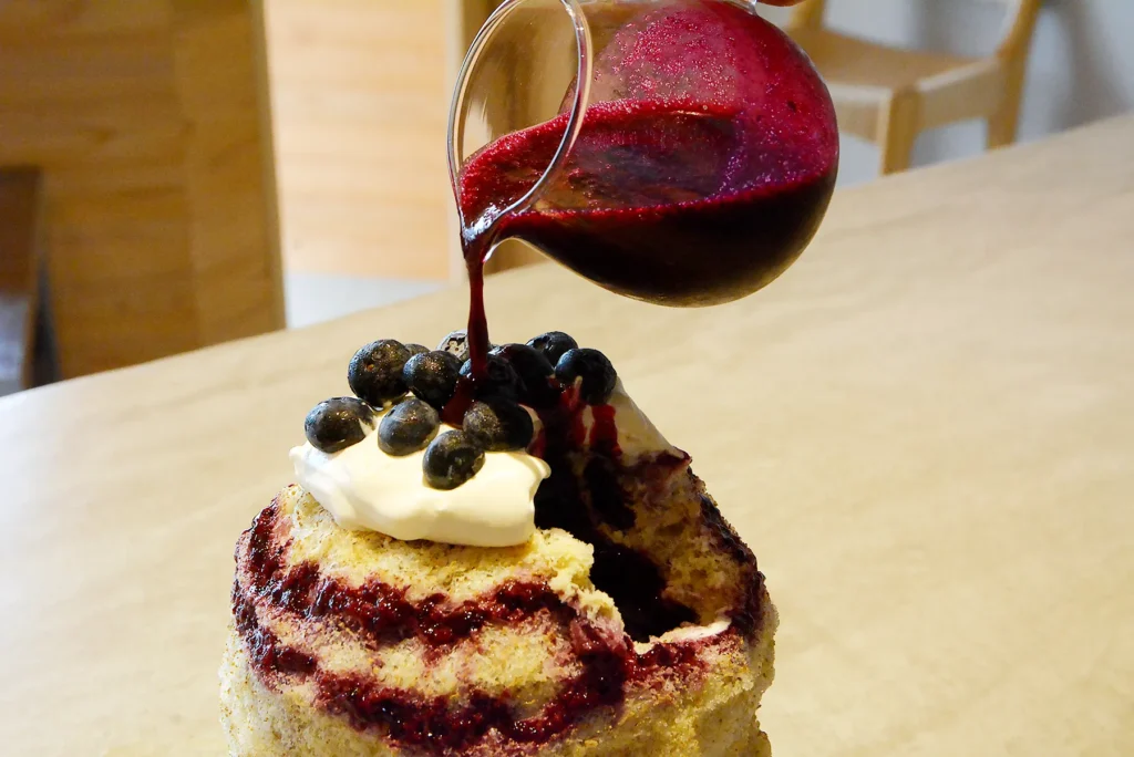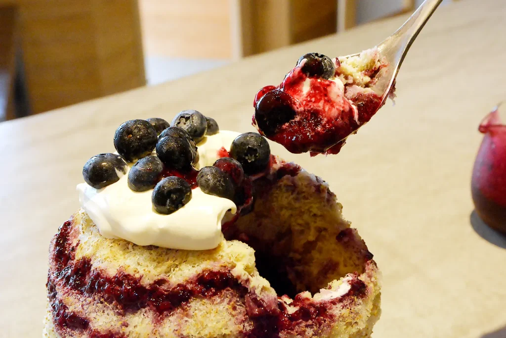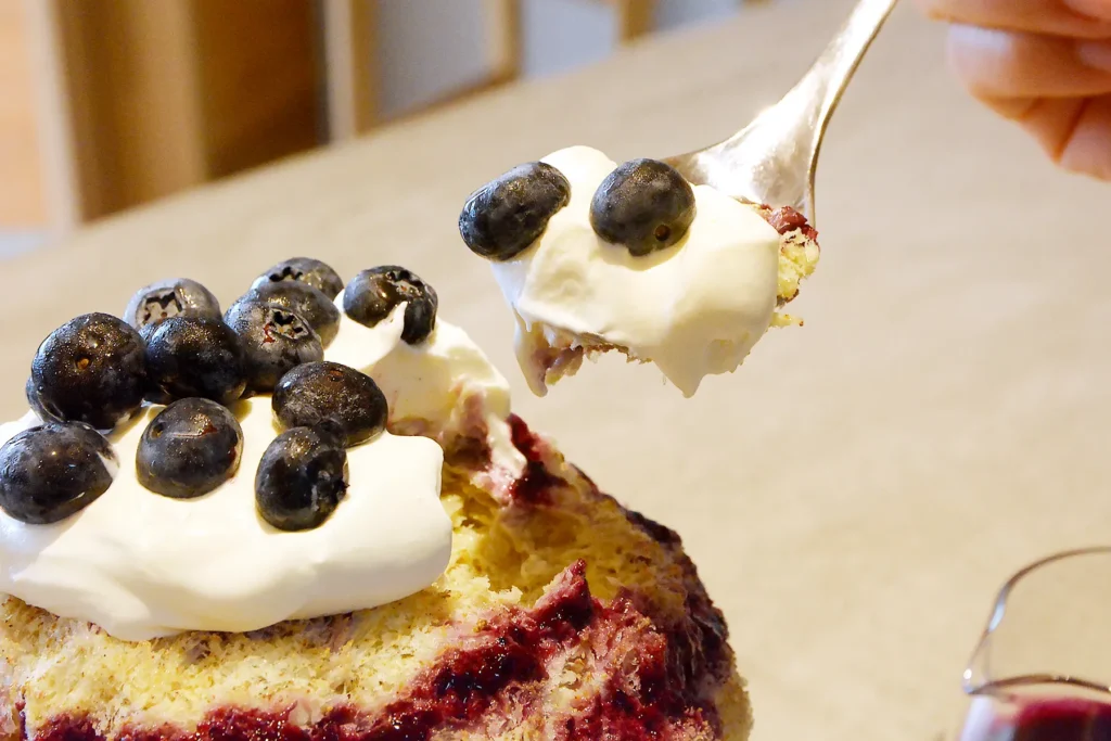ピスタチオの香ばしさとまろやかな味わいが、ブルーベリーの甘酸っぱさにピッタリ。別添えのブルーベリーソースをかけて、最後までおいしさを堪能できます。