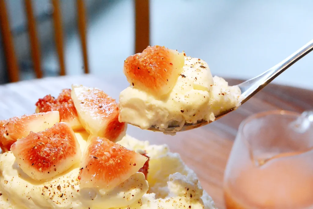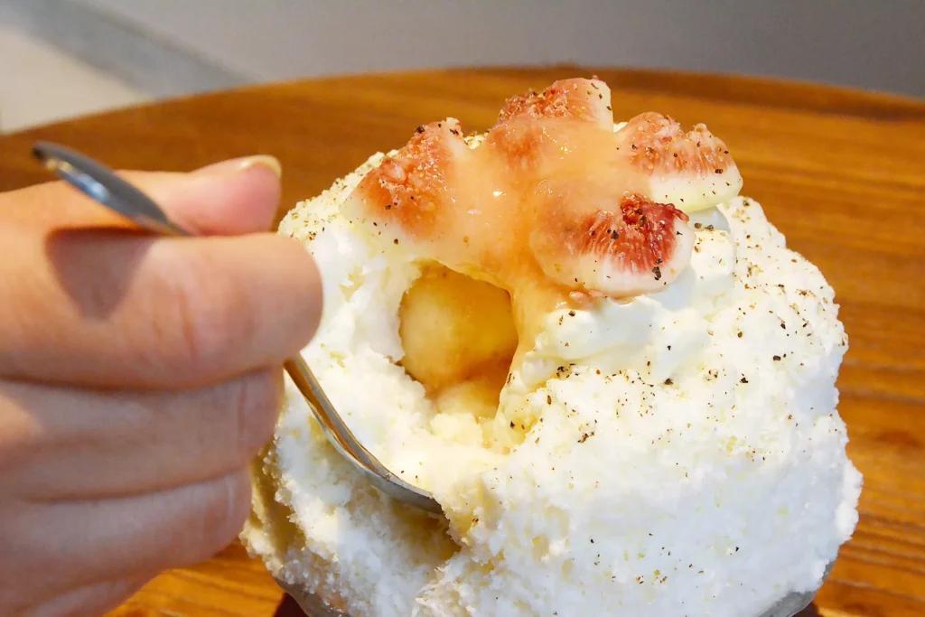 ほんのり黄みがかったソースと優しいピンクがかわいい一品は、夏から秋が旬のいちじくに、白みそ練乳&クリーム、ブラックペッパーを効かせたかき氷。意外な組み合わせに、ドキドキしながら一口…チーズケーキのような濃厚な味わいにびっくり!(チーズは使っていないそうです!)