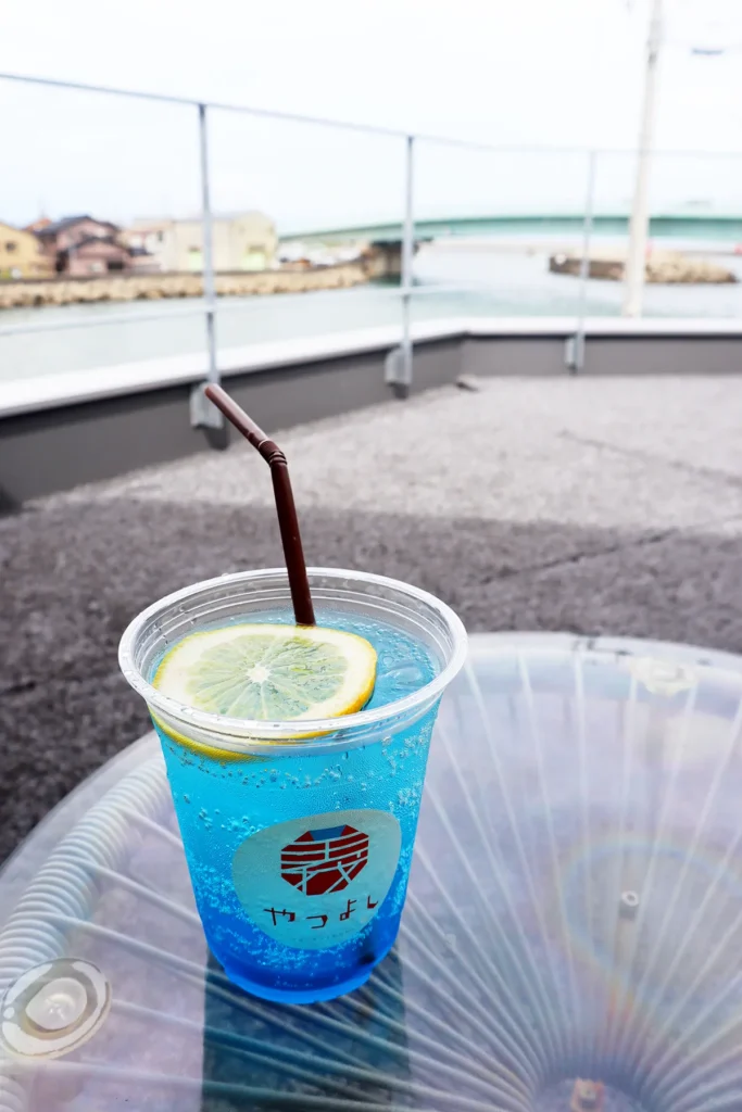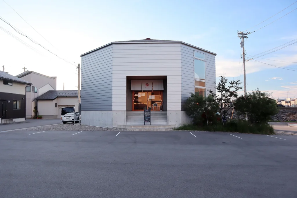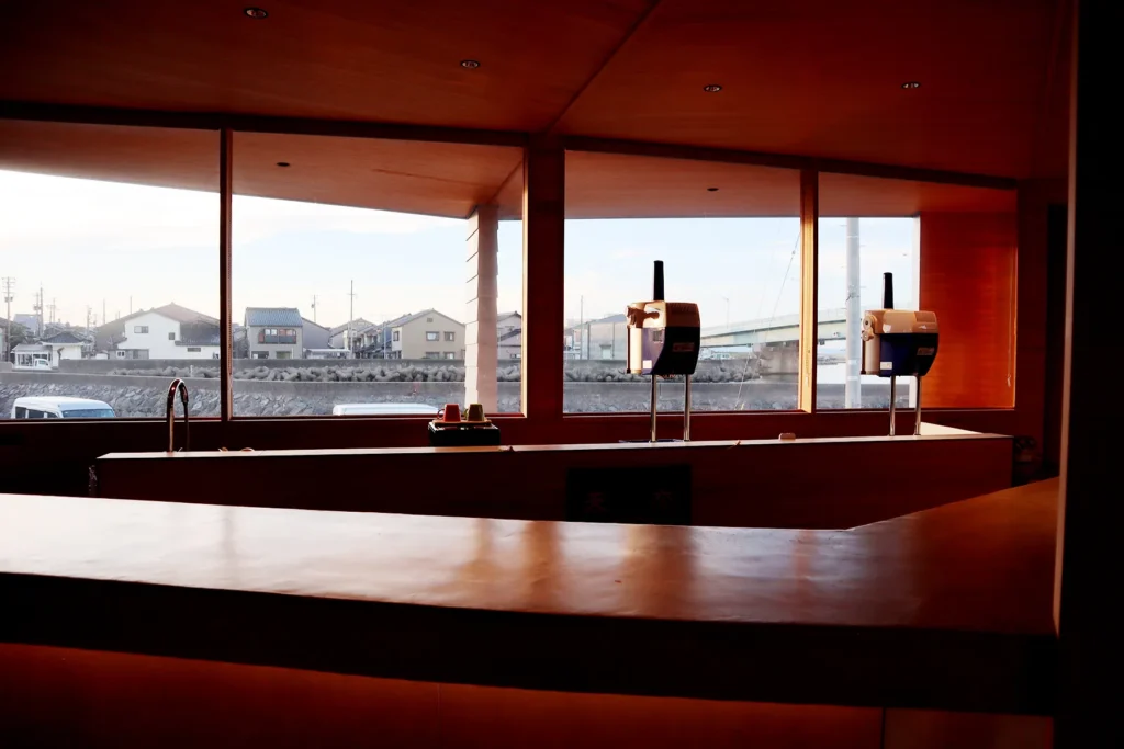 内川沿いの通りから海側の道に入り、一軒家が並ぶエリアに進むと見えてくる、特徴的な八角形の建物のお店です。階段を少し上がって入り口に入ると、見えるのは大きなガラス窓。そこに映るのは、内川と奈呉の浦の海が出合う河口と、向こう岸に並ぶ家々という、ノスタルジックな景色です。