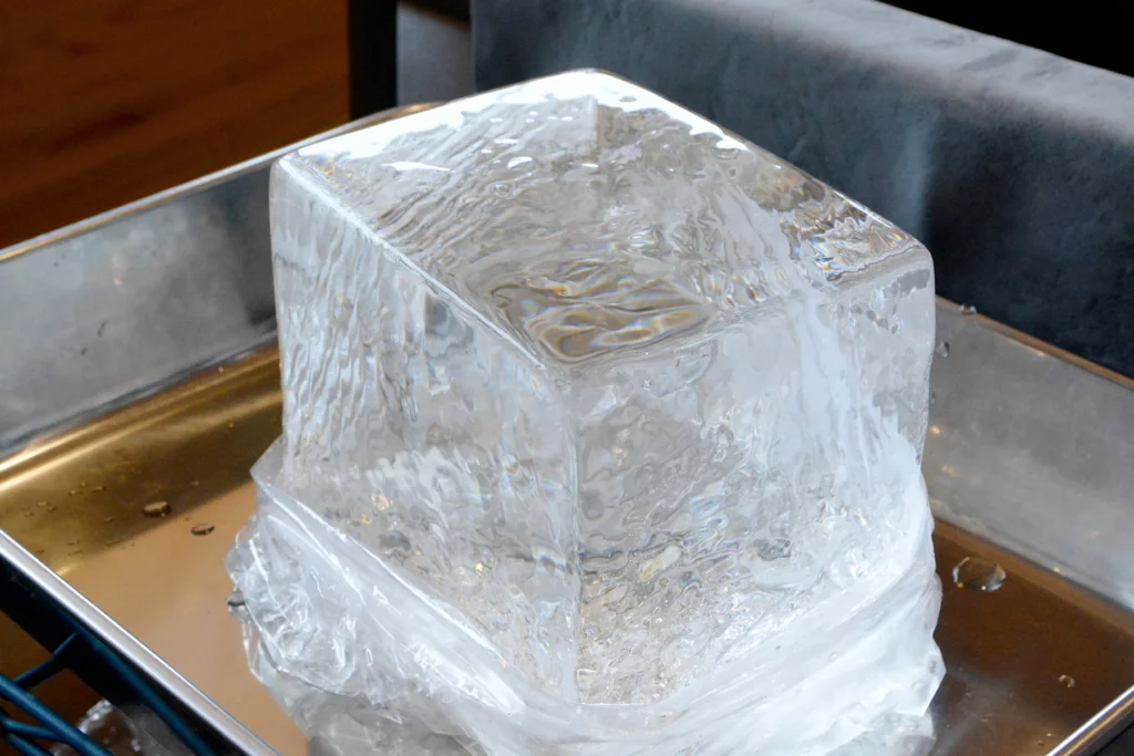 天然氷とは、自然の中の水が、冬の寒さで凍ってできる氷のこと。家庭用冷凍庫(-20℃ほど)に比べ、-5℃から-10℃ほどの比較的高めの温度でじっくりと凍るため、結晶が大きくて壊れにくい、密度の大きな氷へと成長します。