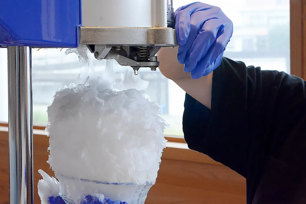 さらに、水の中に含まれている空気や不純物を外へ押し出しながら凍るので、気泡のないきれいな透明の氷になるのです。これこそが、薄く薄く削ることができ、ふわふわなのに溶けにくいかき氷の秘密です。
