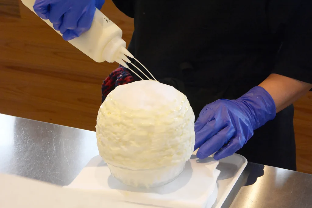氷のふわふわ感を保ちながら絶妙なバランスで器にのせていき、ボリュームたっぷりの丸型に整えられます。その美しい仕上がりは、やつよしの細川さんの熟練の業の賜物。おいしさが最大限に引き上げられ、目の前に現れます。