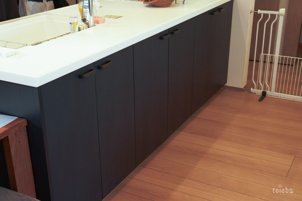 キッチン:リビングの雰囲気に合わせて、家具はウォールナットに統一。