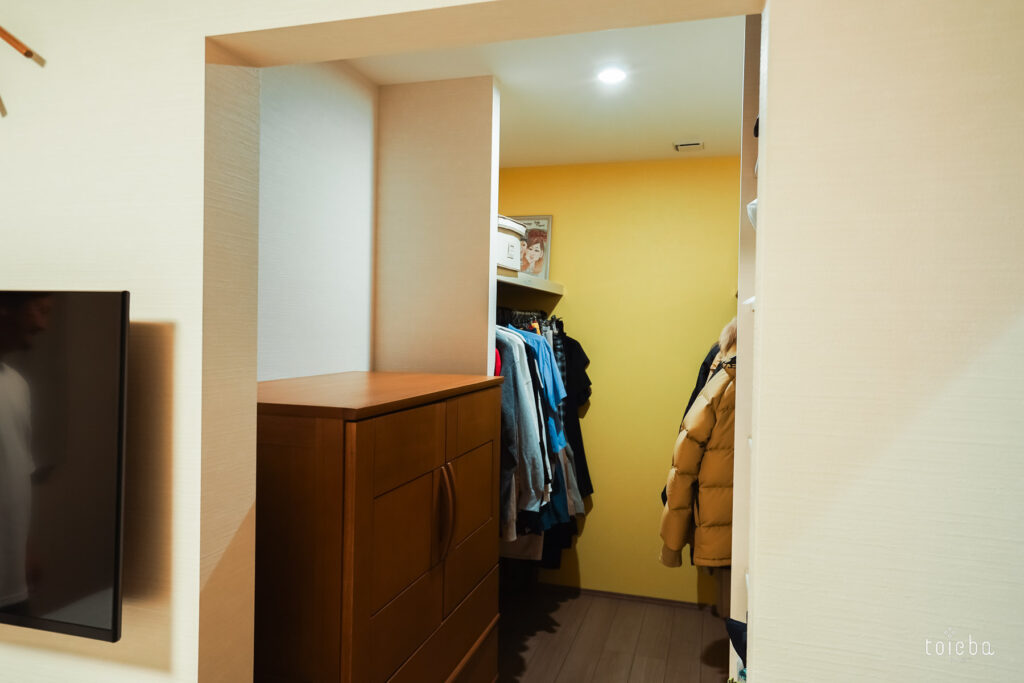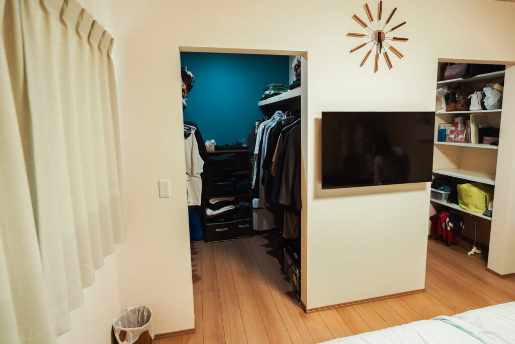 奥様のクローゼットはご主人よりもやや広めにとり、嫁入り道具であるタンスもサイズを測ってぴったり収まっています。