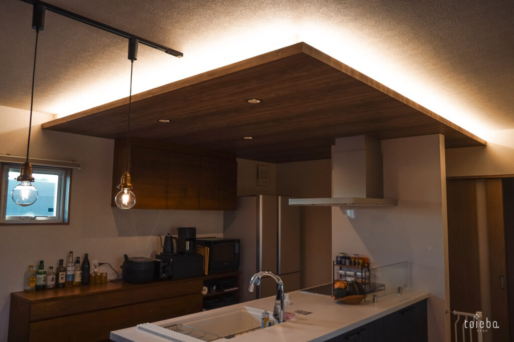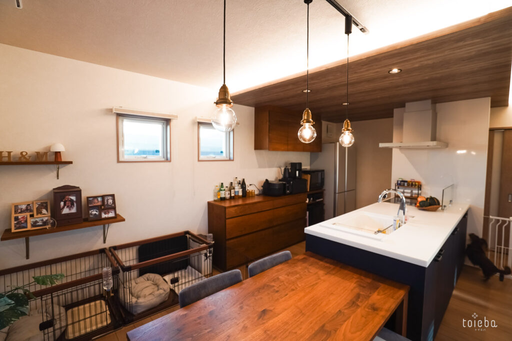 ご主人:リビングです。愛犬とゆっくり過ごすのが好きです。キッチンの天井に間接照明を入れてもらったところがお気に入りです。