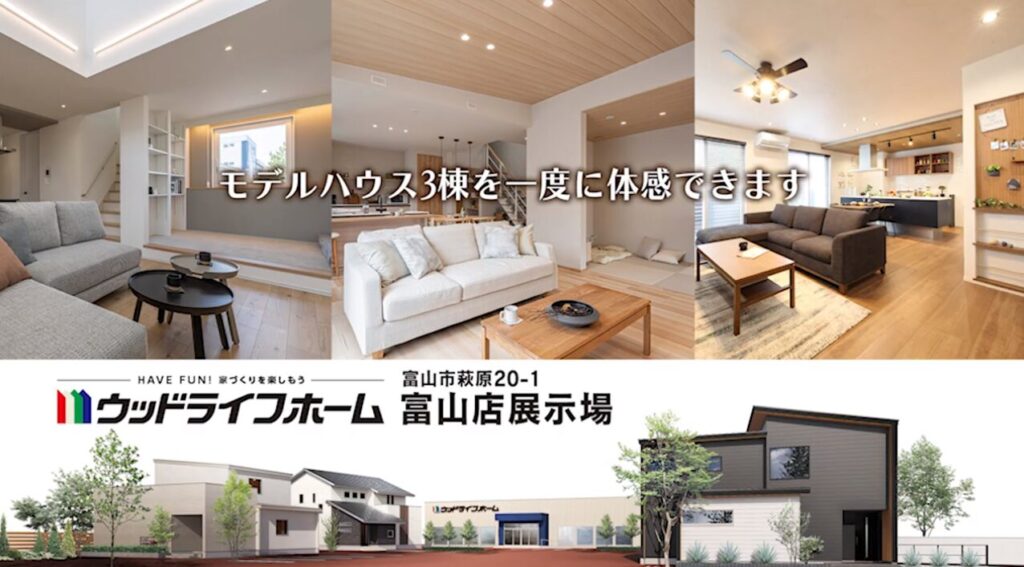 ウッドライフホームのモデルハウスは、富山県内に13か所!また、モデルハウスが複数棟建つ「展示場」は県内に3か所あり、実際に目で見て体感できる場が多いのが特徴です。