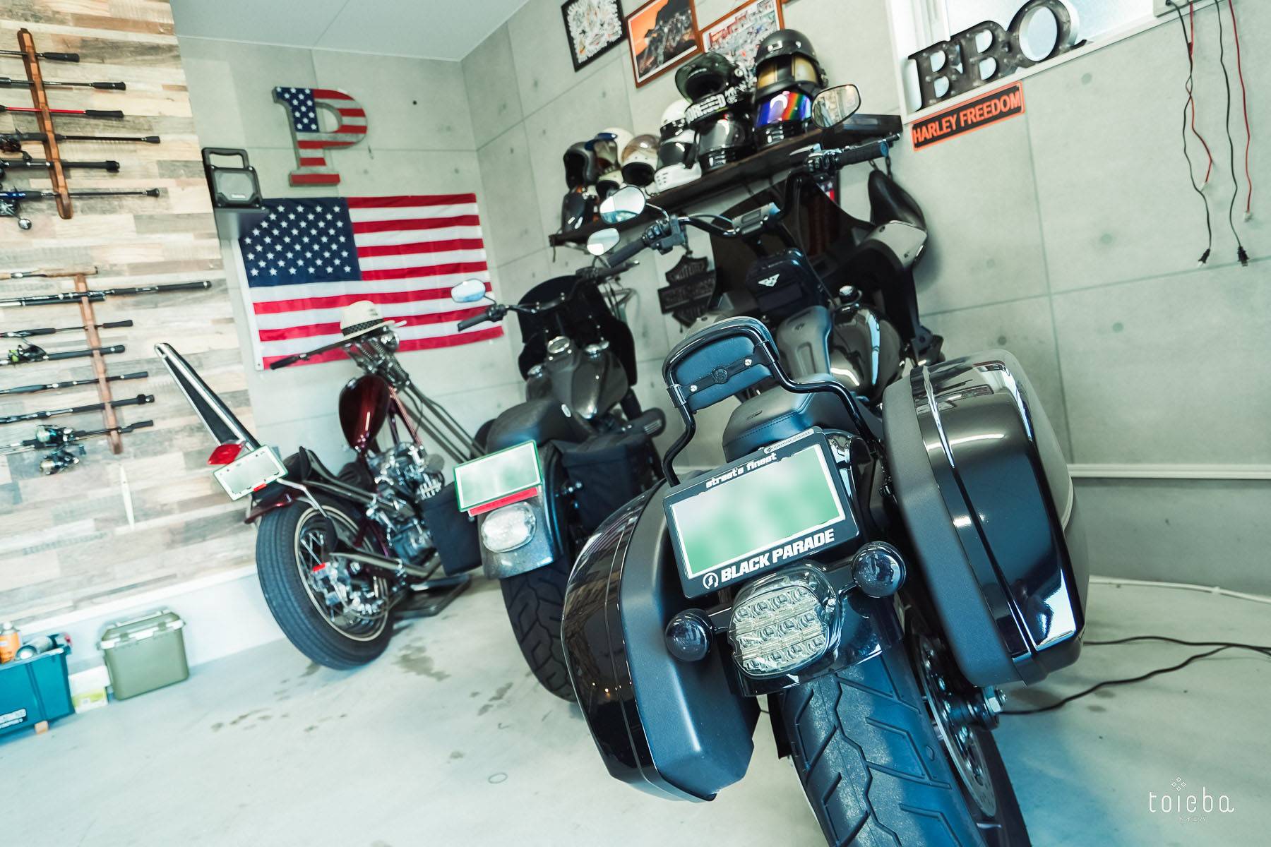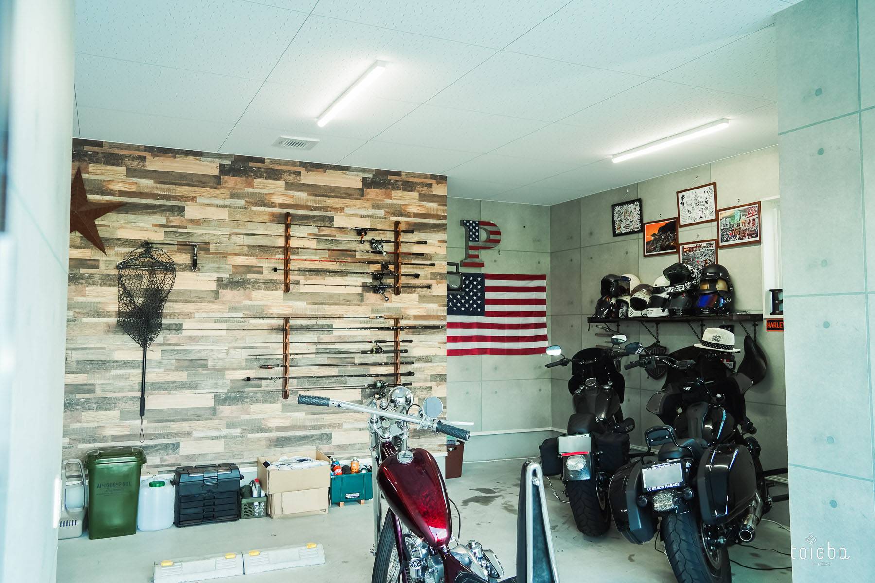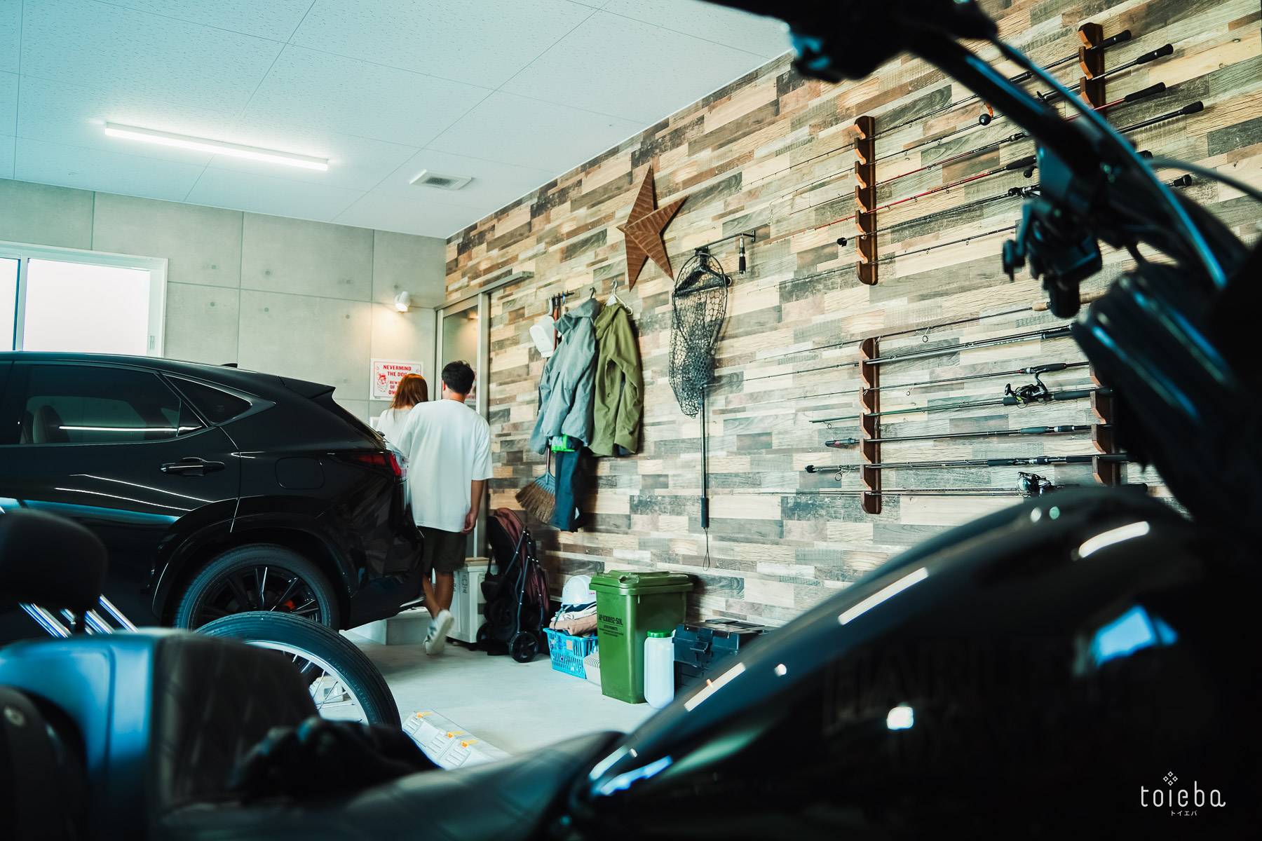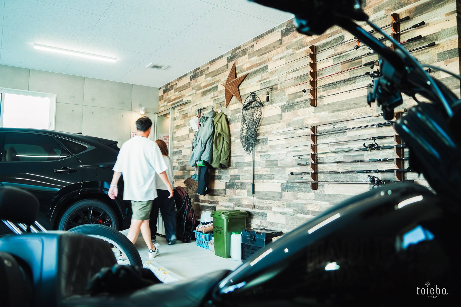 車2台に加えて、 ご夫婦の趣味であるバイクが3台と、ご主人の趣味である釣り道具などが収まるインナーガレージ。ウッドライフホーム営業担当の喜多さんがバイクの寸法もしっかりと測り、すっきり収まるよう設計されています。