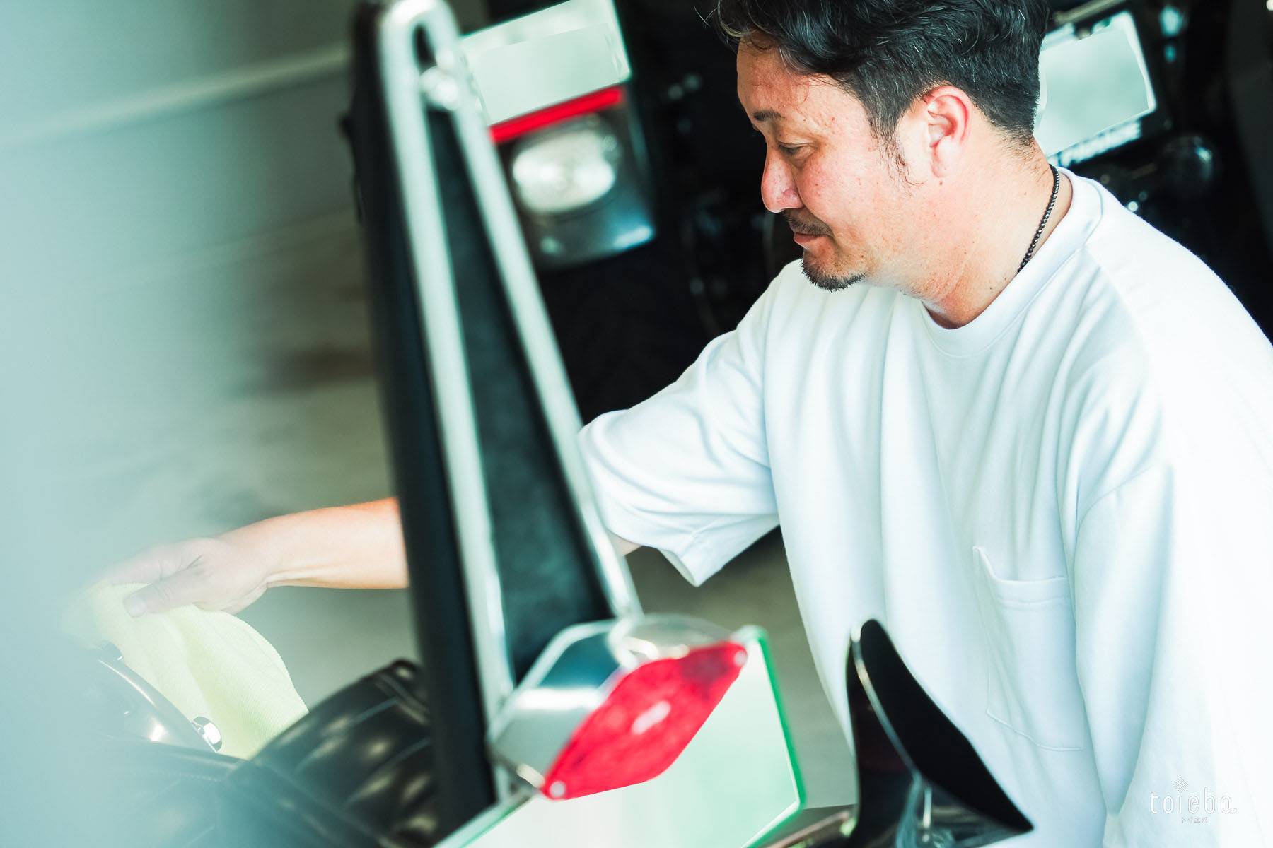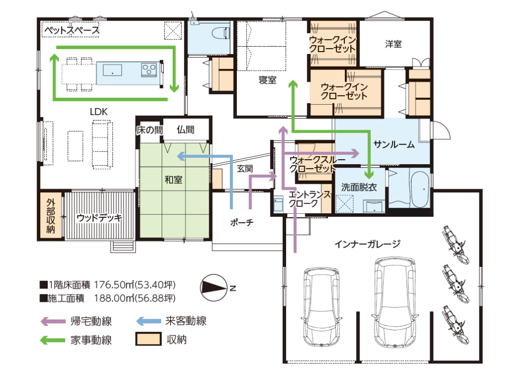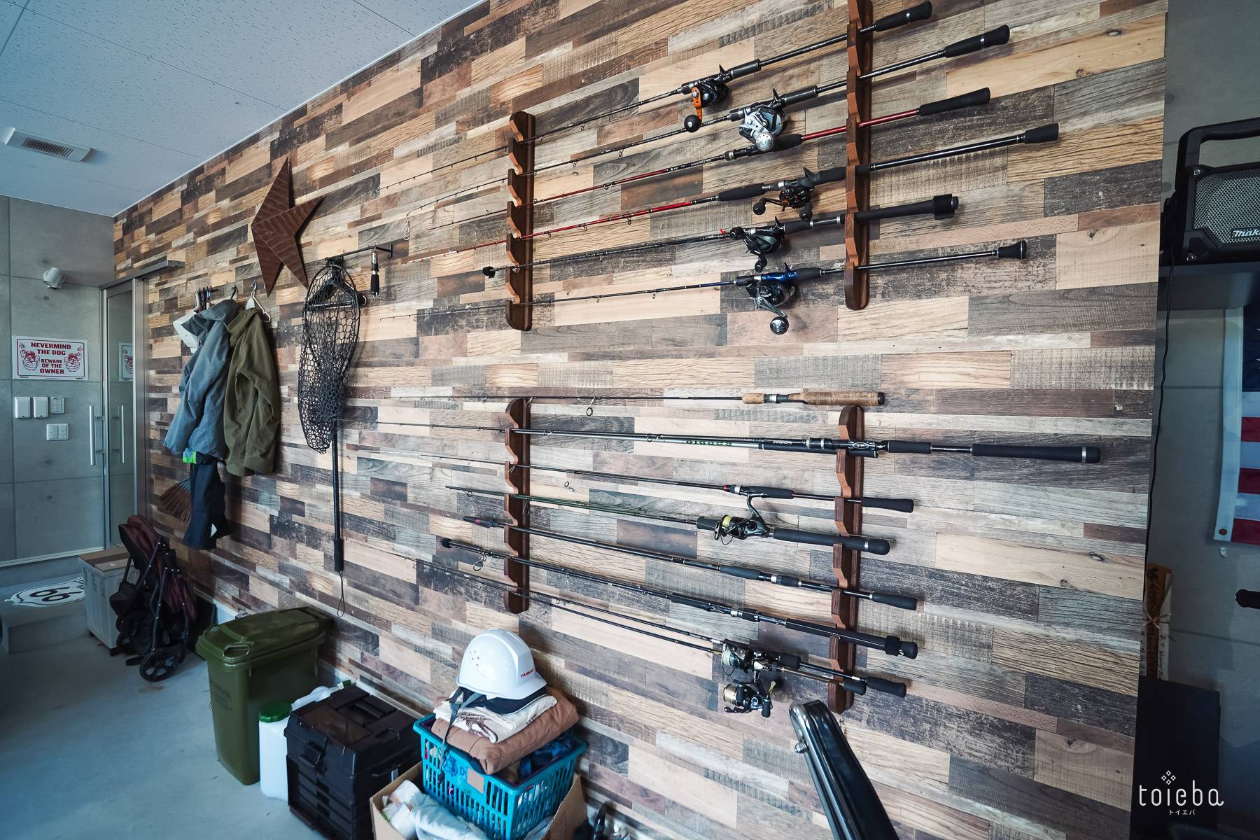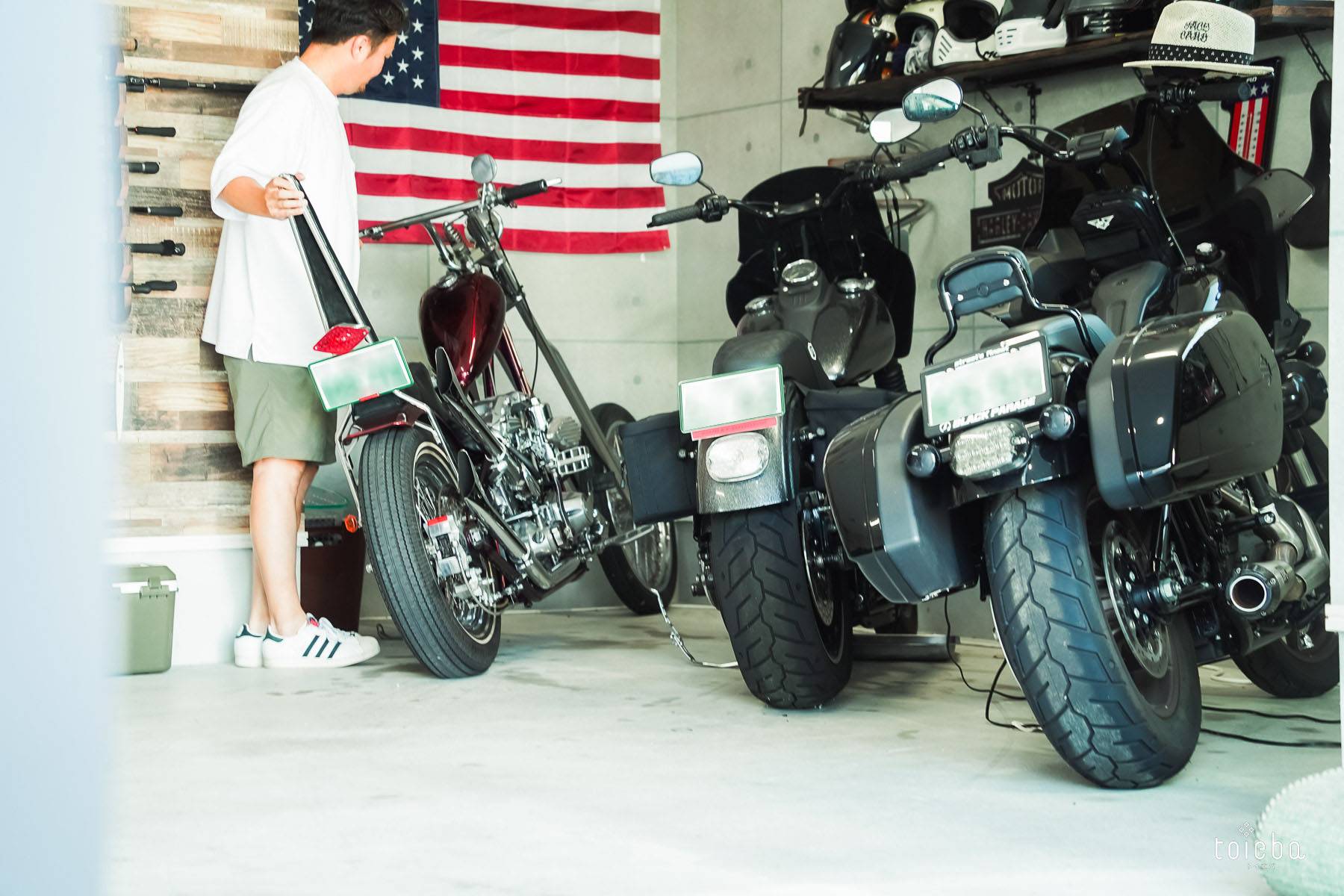 車2台に加えて、 ご夫婦の趣味であるバイクが3台と、ご主人の趣味である釣り道具などが収まるインナーガレージ。ウッドライフホーム営業担当の喜多さんがバイクの寸法もしっかりと測り、すっきり収まるよう設計されています。