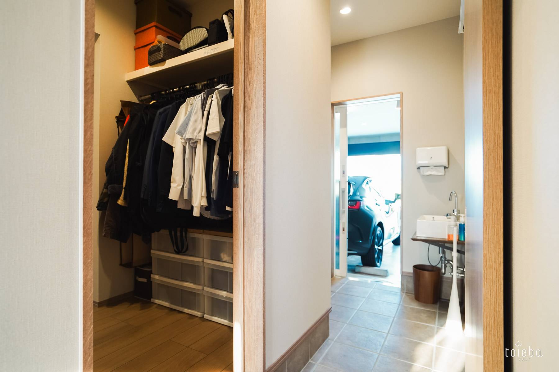 さらに、インナーガレージからの帰宅動線にもこだわりました。ガレージから直接家に入り、手洗い・着替え・お風呂へとつながる動線を設けたことで、きれいな状態でリビングに入ることができます。