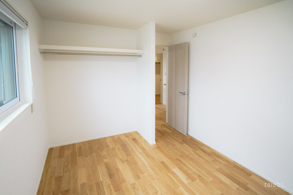2階のプライベート居室にも、細やかなポイントが。プライベート空間では往々にして開けっ放しになりがちなクローゼットの扉を最初から取り払い、オープン収納に。窓の位置を高くすることで、外からの視線を気にせず、勉強机やベッドの配置も自由に決められます。