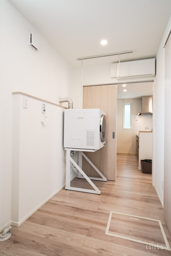 キッチンから地続きになっているランドリールーム。洗濯機、ガス衣類乾燥機まで置ける広々スペース。天井には吊り下げ式の竿掛けが2ヶ所にアリ。
