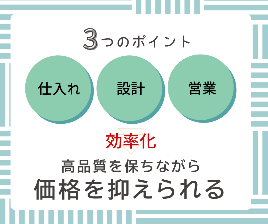 ✅これまでの実績から特に満足度の高かった仕様・間取り・デザインをパターン化することで、仕入れコストを最小限に抑えています。