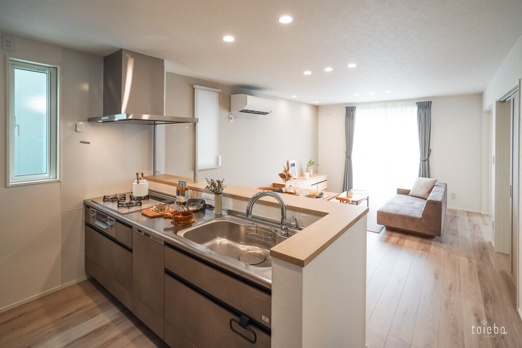 キッチンは家族の様子を見ながら料理ができる対面式。3口コンロ、大きめサイズの食洗機など、最新のシステムキッチンが採用されています!