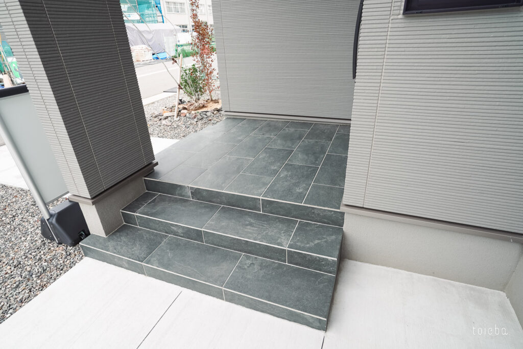 広々とした玄関アプローチにも注目!雨や強い日差しを防ぐだけでなく、家族が同時に出入りする際や、訪問者の待機スペースとしても十分な広さがあります。ベビーカーや宅配ボックスなどを置くにも余裕があり、近年このスペースを広めにしたいという人が多いのだそう。