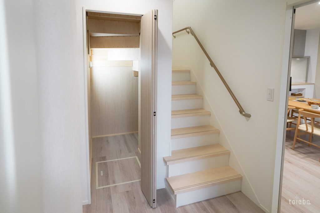 2階に上がる前に、階段下の収納もチェック。家族の成長とともに、どうしても増えてしまう荷物も大容量で収納できるので安心です。床下収納もこの場所にあるため、普段使わないものや長期保存できる食材などを人目を気にせずしまっておくことができます。
