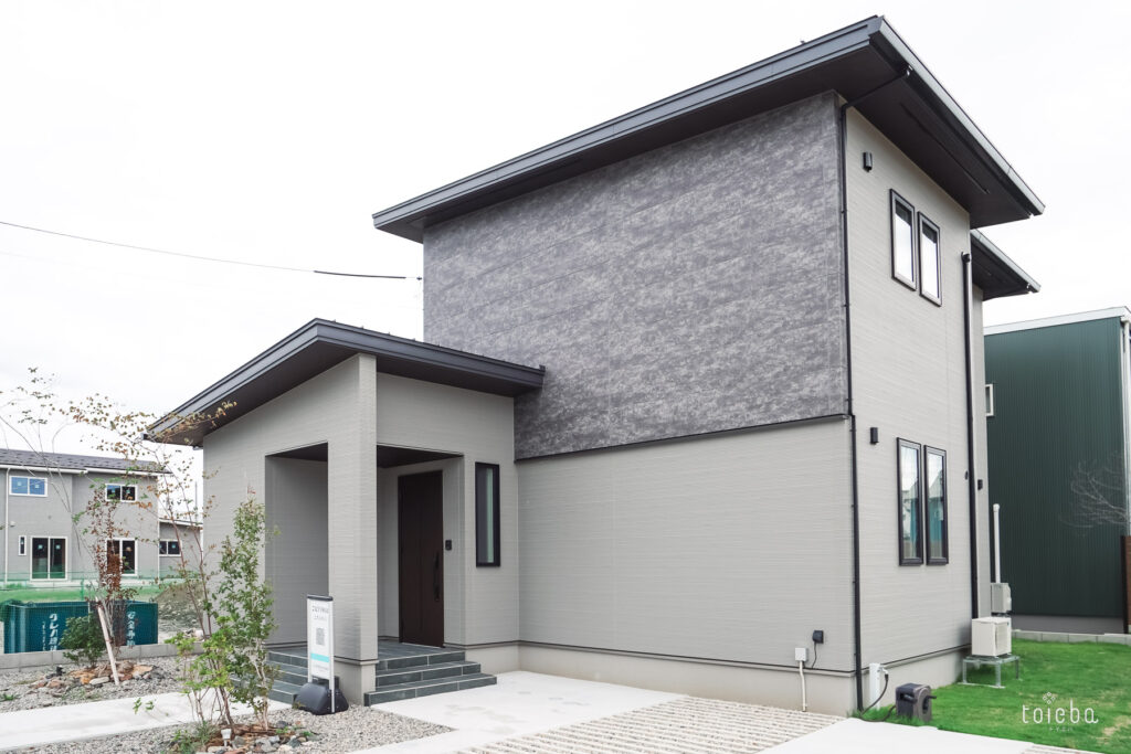 今回訪れたモデルハウスは、流行のグレイッシュカラーで統一されたシンプル&モダンなデザイン。機能性を兼ね備えた直線的なフォルムが特徴で、周辺環境にも自然に馴染んでいます。