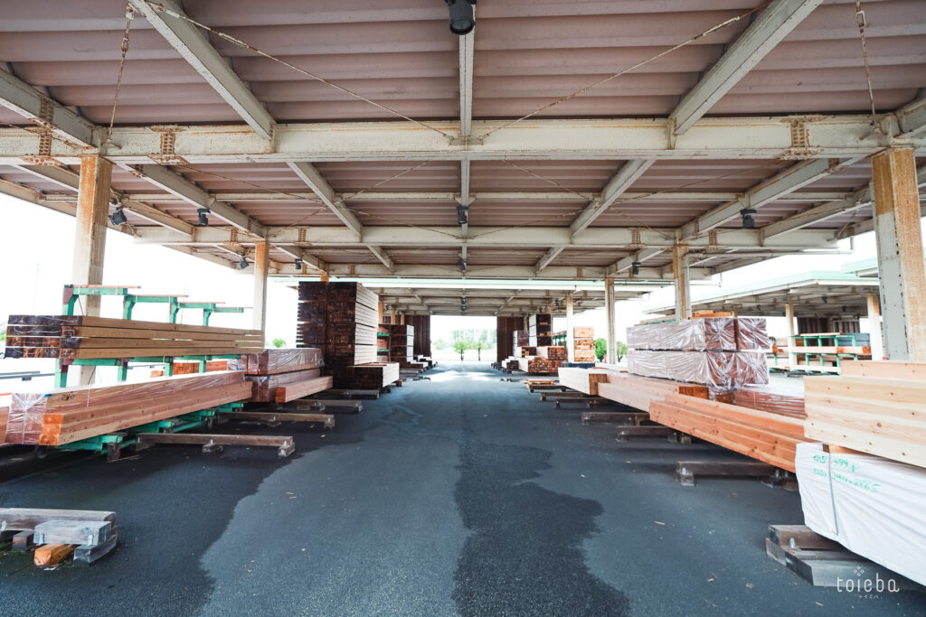 まずは木材の保管場所であるストックヤードを見学。全ての木材は屋根の下で保管され、雨などの影響を受けないようビニールで丁寧に包まれています。