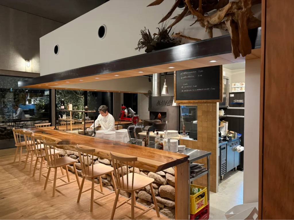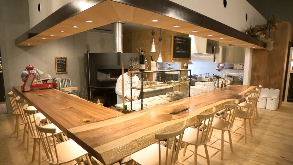 PORT PIZZA NAVEの店内には、茨城の神社にあったご神木を利用した一枚板のカウンターがあり、目の前でピザの成形から焼き上げまでを楽しめるオープンキッチンになっています。