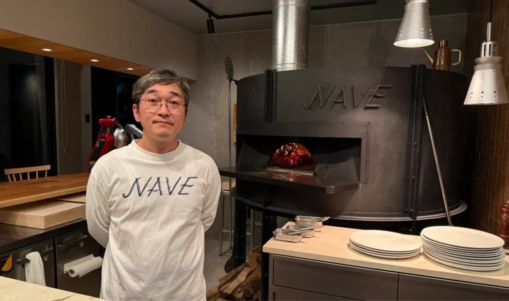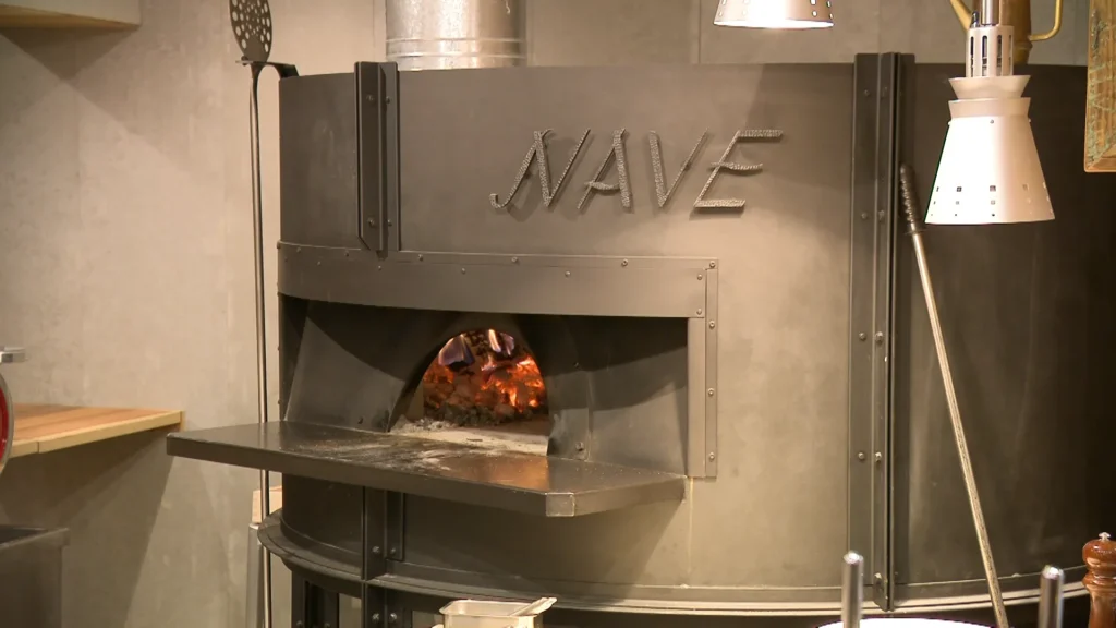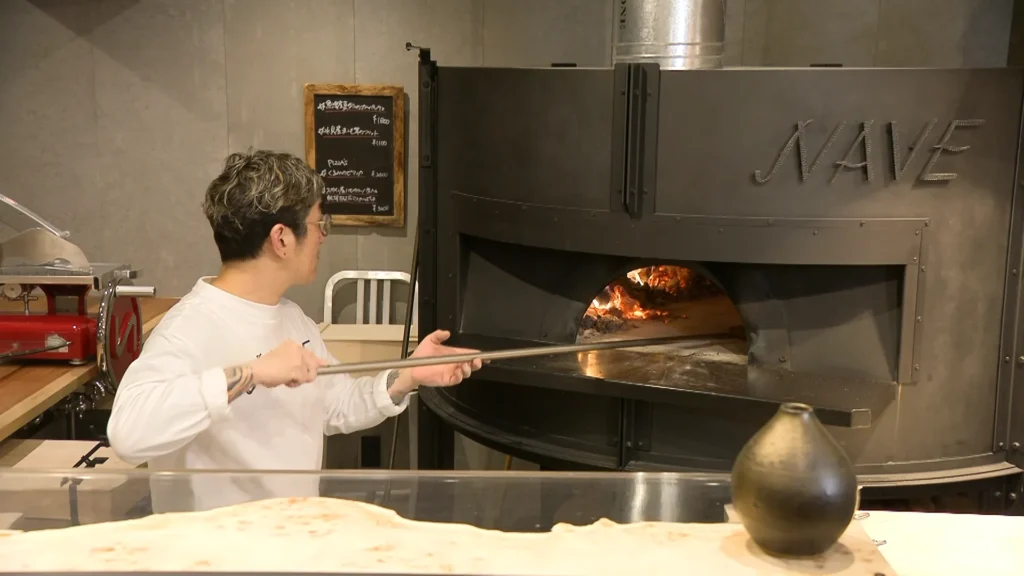 ピザ窯は、世界中のピザ店から注文を受けているという東京の山宮かまどが手がけ、さらに岩瀬地区のアーティストが窯の脚や店名のNAVEのロゴを装飾しました。