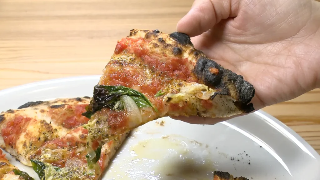 一口食べると、小麦の風味が口いっぱいに広がり、もっちりとした歯ごたえとサクッとした軽さを同時に感じられます。熟成したからこそうまみと甘みが強く、重くならないので一人で一枚ペロッといけます。