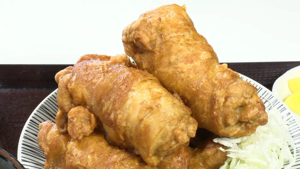 目を引くのが名物の「唐揚げ」。ひとつひとつがまさに“こぶし”ほどの大きさで、鶏もも肉1枚をくるっと巻いて仕上げるという丁寧な調理法が使われている。