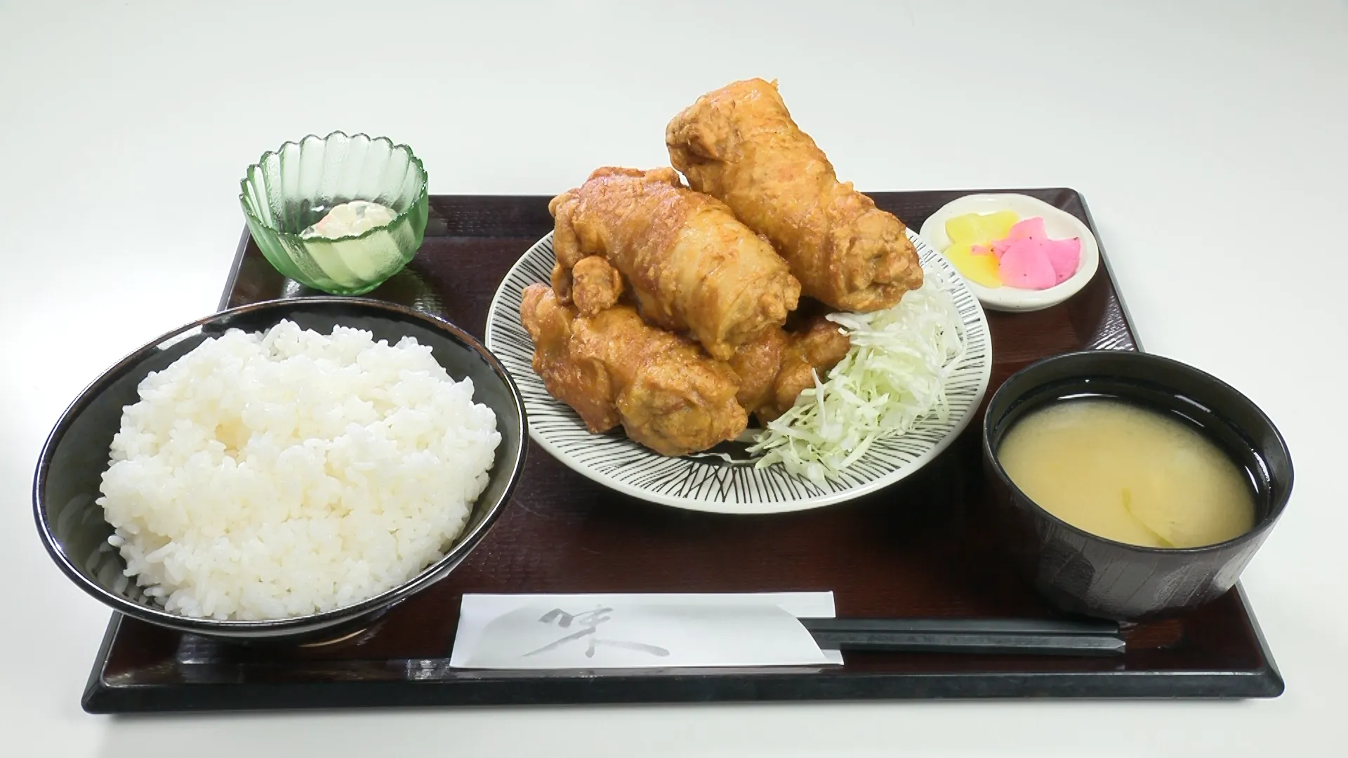 唐揚げは3個で1,000円(税込)、5個で1,500円(税込み)10個で2,000円(税込)の単品換算で、オプションとして400円(税込)で、白ご飯(並)、味噌汁、小鉢がセットされると、豪快ながらも“定食らしい安心感”が得られるのもうれしい。