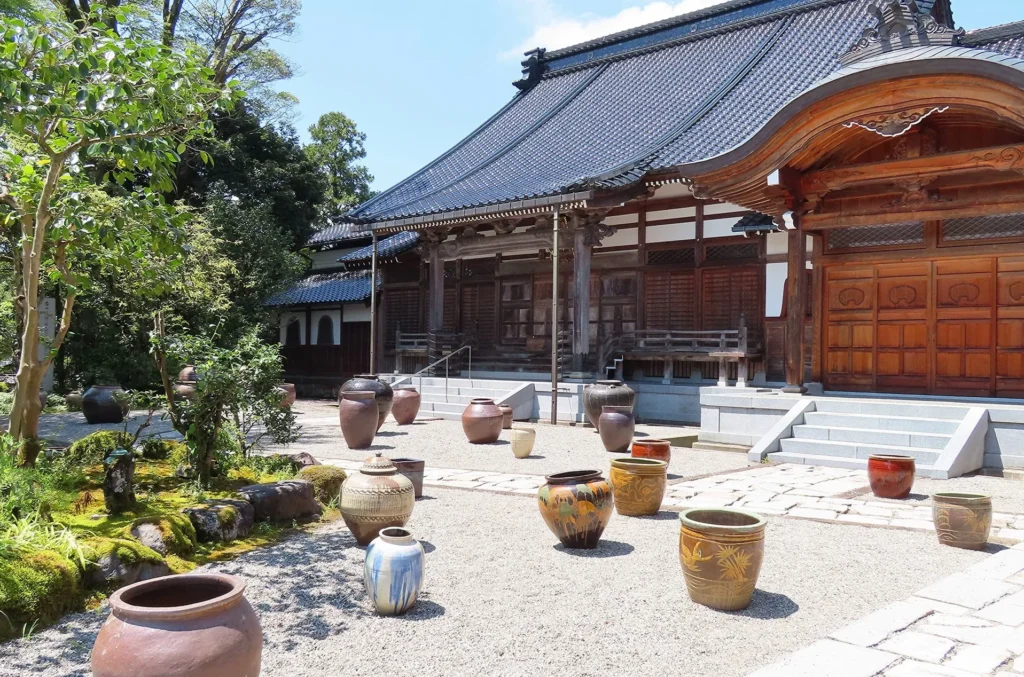 山門をくぐると、境内には丸みのある壺や鉢がずらりと並び、水に浮かんだ花に心が癒されます。建物内には、18世住職が民芸運動に共感して集めた、李朝の壺や陶芸家たちの作品など、世界中の工芸品が多く展示されており、まるで美術館のようです。