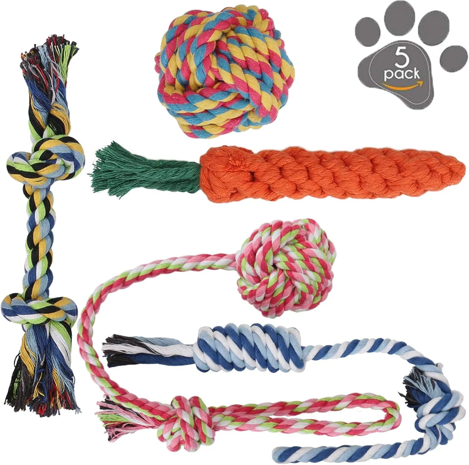 長さの異なるロープやにんじん型のロープなど、さまざまな形が揃った犬用ロープおもちゃ5点セットです。