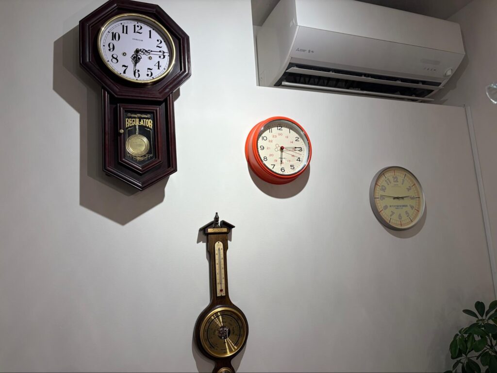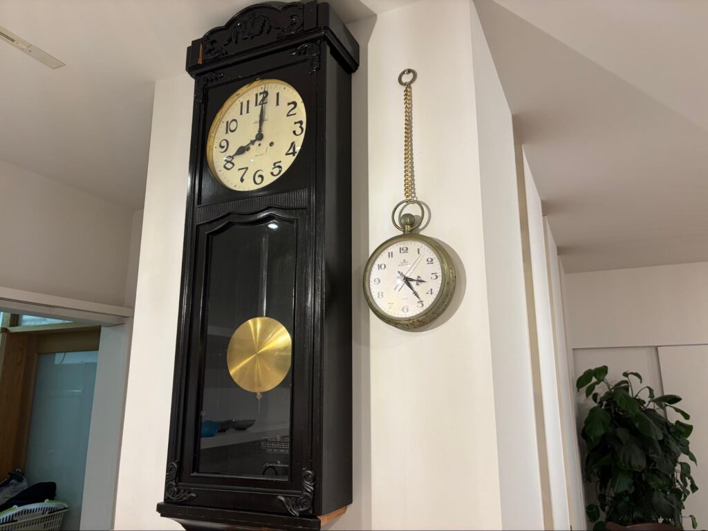 富山県内のたくさんの家具屋へ足を運び、一目ぼれした家具たちを揃えました。ソファを購入した近所の家具屋さんで、お店を出るときに動いていない「古時計」が目にとまりました。
