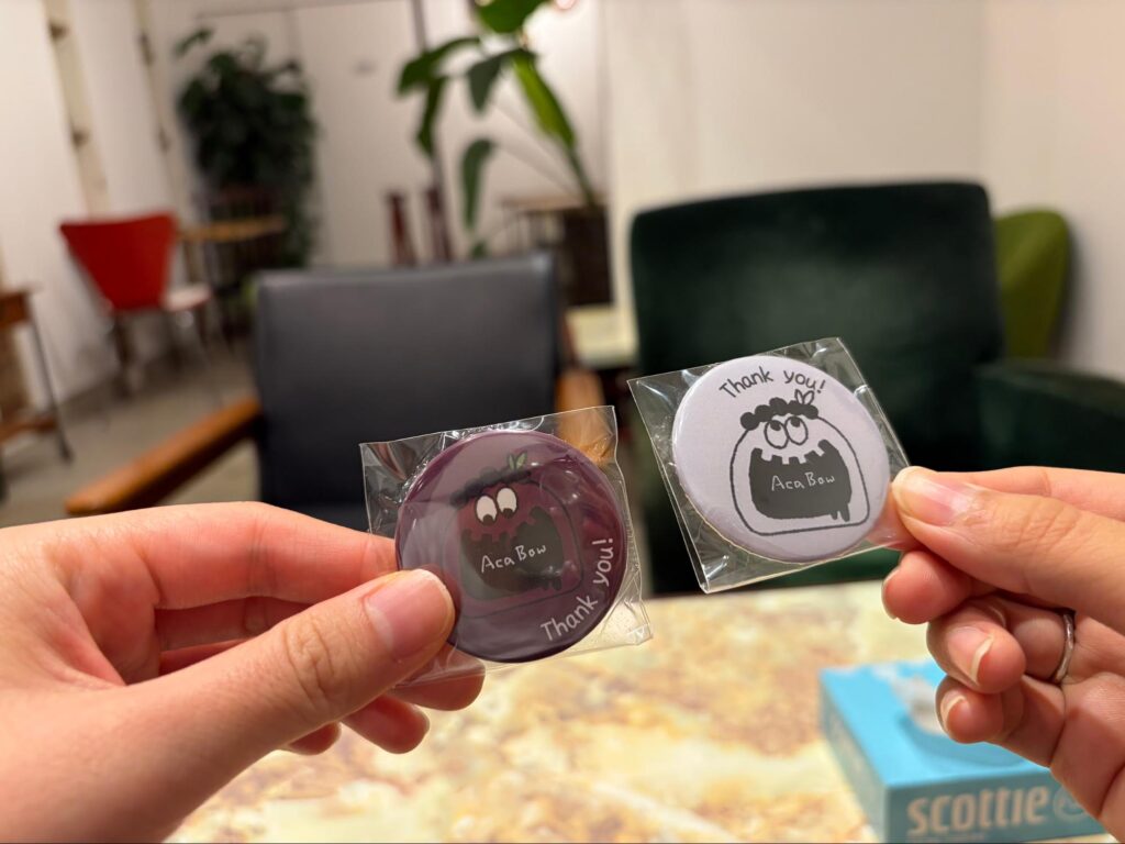 店長の澤田さんはアサイー工房のキャラクター「あさぼう」が描かれた缶バッチを作り、スタッフのエプロンにつけています。通ってくれた方にプレゼントできたらと考えているそうですよ。