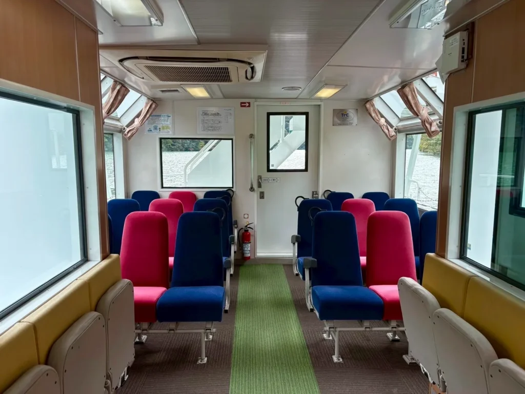 船内には屋内の客席があり、雨の日でも快適な船旅が楽しめます。