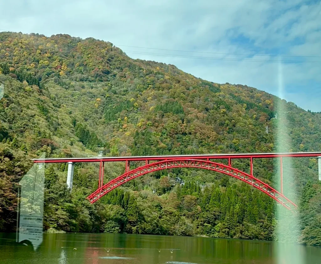 緑の自然の中にある赤い長崎橋はとても鮮やかで、水面に映った姿も、また綺麗ですよ。紅葉の時期に見られる、赤い長崎橋とオレンジに染まった山々のコントラストは、ここでしか見られない絶景です!
