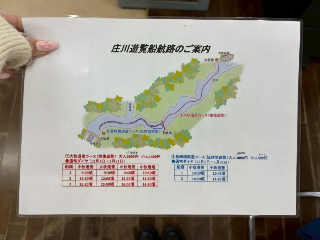 庄川峡遊覧船には「長崎橋周遊コース」と「大牧温泉コース」の2種類の航路があります。