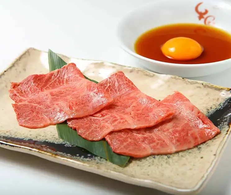 ランチの「特選焼肉ランチ」や、2名から注文できる「富山育ち あじわいコース」、「富山育ち プレミアムコース(予約がおすすめ)」は、「サーロインの炙りすき焼き」を食べられる人気メニューです。薄く大きくスライスしたお肉を軽く炙り生卵にくぐらせると、とろけるような旨みをしっかり感じられます。