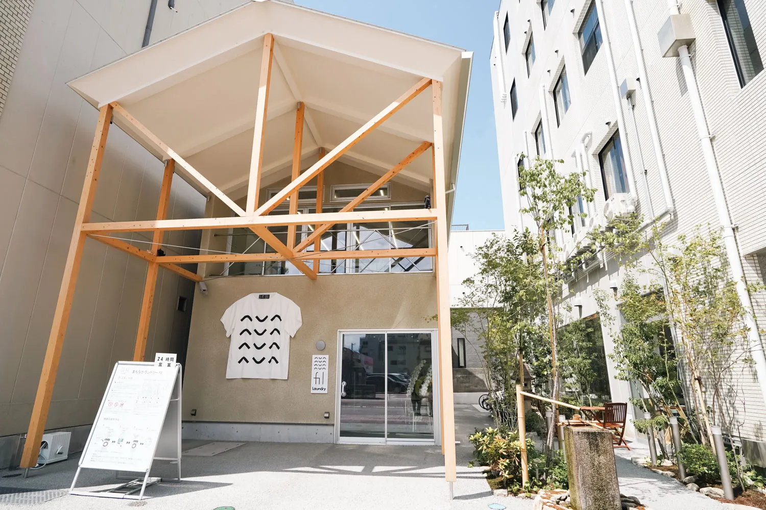 富山市荒町の市電通り沿い、荒町駅すぐそばにある「まちなかランドリー fil」。大きなTシャツの看板が目印の、おしゃれな外観が特徴です。24時間・年中無休で営業しているため、夜間や早朝の利用にも便利なコインランドリーです。