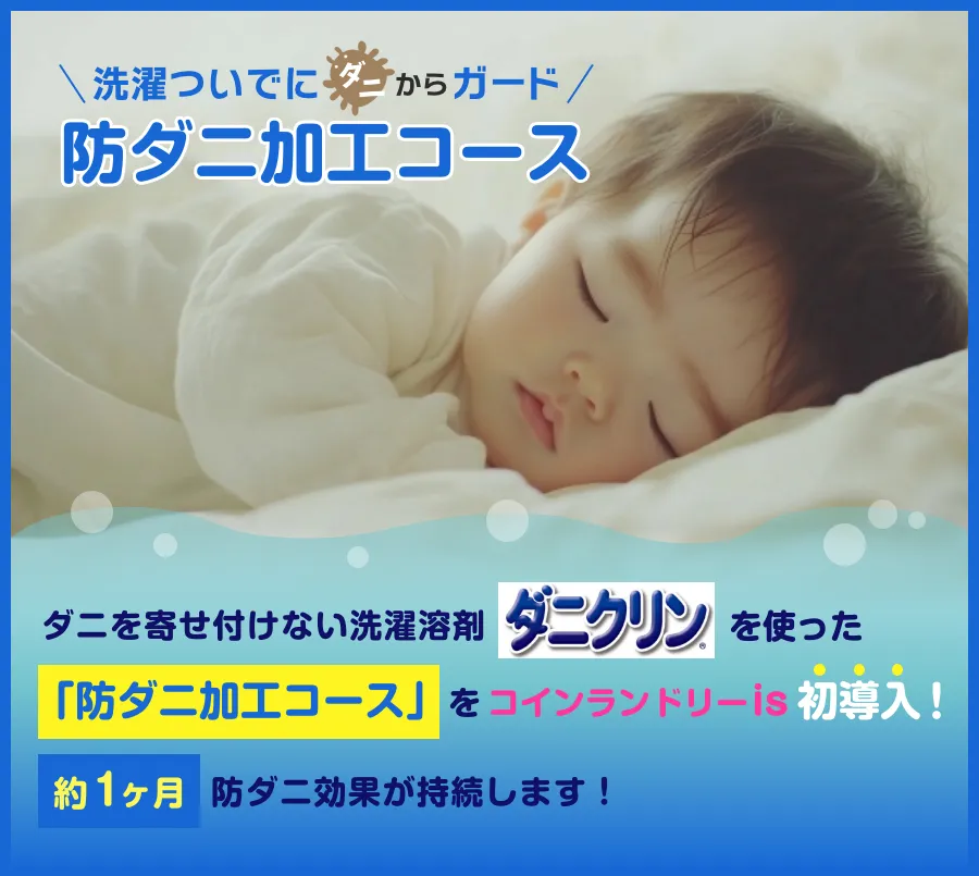 洗濯時には自動で投入される「ダニクリン」を使用しているところが特徴です。殺虫剤ではなく、ダニを寄せ付けにくくする洗濯溶剤のため、ペットや小さな子どもがいる家庭でも安心です。