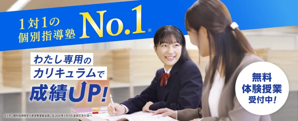 「個別指導WAM」は、指導実績20万人以上、授業満足度97.4%(2023年3月時点)という実績を誇る塾です。生徒一人ひとりの通う学校や学年に合わせて過去問や傾向を分析し、定期テスト対策や受験対策をオーダーメイドで組むため、地域の教育環境に沿った学習が可能です。